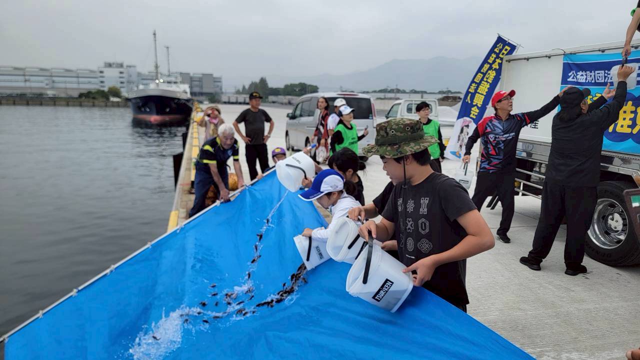 クリーンアップ後には(公財)日本釣振興会によるカサゴの稚魚約5,000匹が放流されました。放流に参加した子どもたちも「大きくなあれ!」と楽しそうでした。
