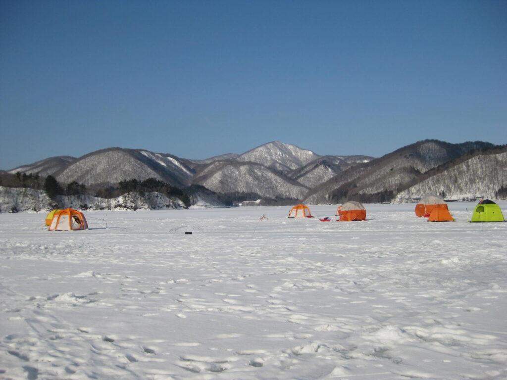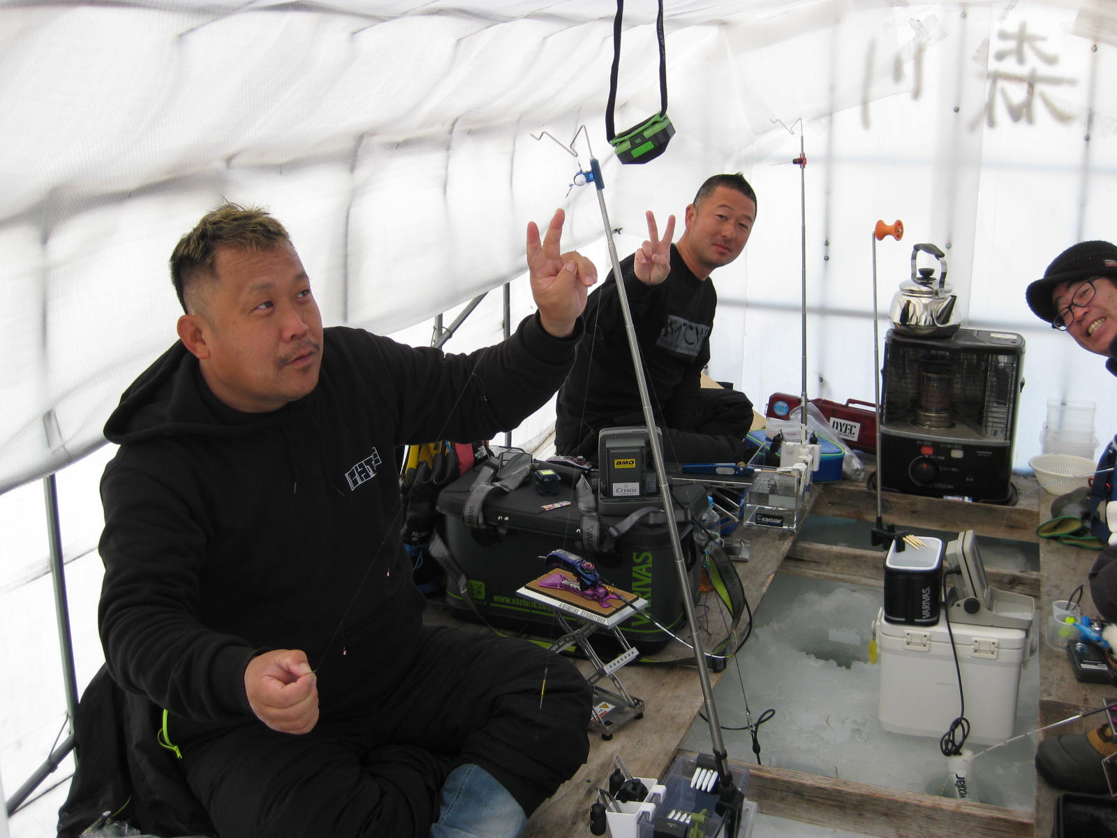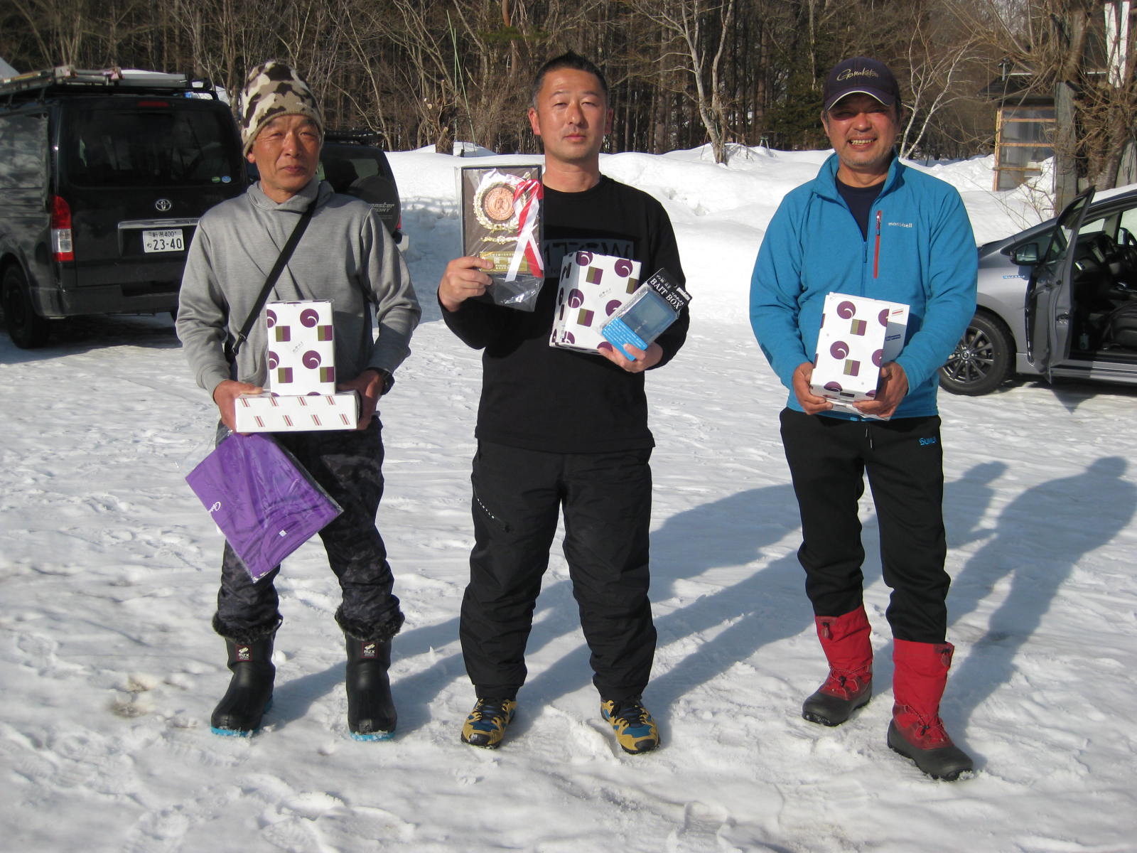 2026年2月15日(日)、福島県の裏磐梯に位置する桧原湖で参加者12名によりワカサギ釣り懇親会を実施しました。今シーズンの桧原湖は氷が薄く部分的に氷上釣り解禁となり、早稲沢地区の氷上小屋を利用して審査方法はワカサギの総重量としました。前情報として桧原湖全体で激渋状態のため苦戦が予想されましたが、当日は朝から快晴微風で天気に恵まれて一安心。準備を済ませて釣り開始!魚探の反応はあるのですが、なかなか当たりが出ず、皆さん色々と試行錯誤で苦戦していました。今回も総重量勝負のため、いかに良型を釣るかが勝敗のカギとなりました。そして14時30分で納竿となり、駐車場に戻って検量ですが、堀川 政彦さんが47g(35匹)で昨年に続いて優勝となり、2連覇を達成しました。おめでとうございます。2位は37g(31匹)で投げ釣りも上手な大川 和佳さん。3位は27g(13匹)で上位常連の黒崎 隆志さんでした。激渋状態としてはなんとか釣果が出せたと思います。今回は天候に恵まれ、また限定的にでも氷上釣りが実施でき、最高の景色と釣り談義で大いに盛り上がった懇親会を実施することができました。各参加者の皆さん、いつも親切に笑顔で対応してくださる森川荘の親父さん、協賛品提供のがまかつさま、誠にありがとうございました。