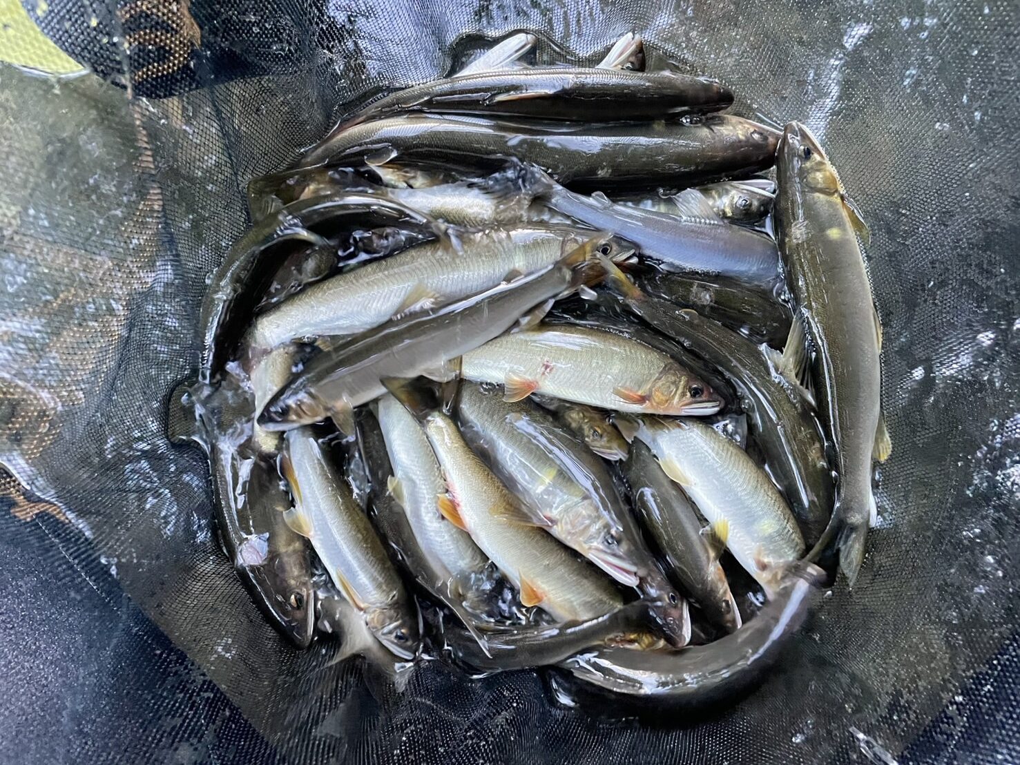 当日は渇水、そして猛暑という厳しいコンディションでしたが、検量時刻の14時まで参加者の皆さまはそれぞれ”大鮎”が潜むポイントへとスタートされました。8月以降、各所で25㎝を超える鮎が掛かり始めていたこともあり、今回も”大鮎”への期待が高まる大会となりました。検量の時間になると、丸々と肥えた大鮎が次々と持ち込まれ、会場は一気に熱気に包まれました。「あー、あと1cm、、、」「2mm小さいやん!」「デカーー!」「どこにこんなにおったん?」といった歓声や悔しがる声が飛び交い、検量会場は大いに盛り上がりました。その結果、28.6cmの鮎が優勝、28cmが準優勝となり、なんと参加者の4割が27cm超えの鮎を釣り上げるという非常にハイレベルな大会となりました。毎回のことながら、会員の皆さまの腕前にはただただ感心させられます。また、最後の抽選会も大いに盛り上がり、笑顔あふれる楽しい時間となりました。本大会の開催にあたり、ご参加いただいた会員の皆さまをはじめ、ご協賛・ご協力を賜りました、GAMAKATSU PTE LTD様・揖保川漁業協同組合様・代表理事組合長様・髙井釣具店様に心より感謝申し上げます。